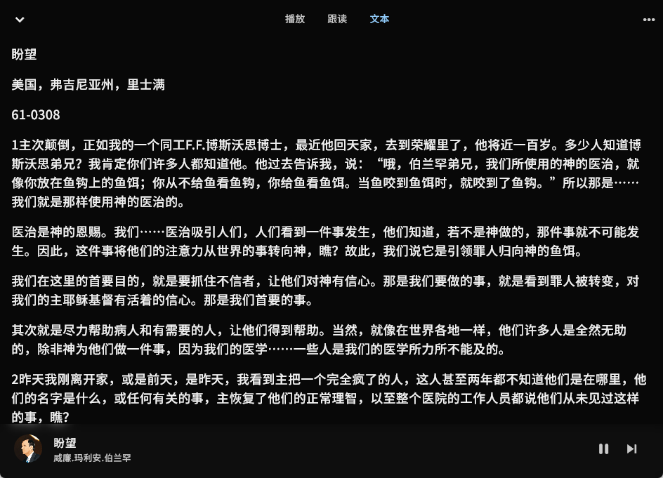 进入播放页面后点击最上面的“跟读”会进入跟读页面,跟读功能只在播放"32K"音源音频时候才工作,而音频播放时才显示文字。